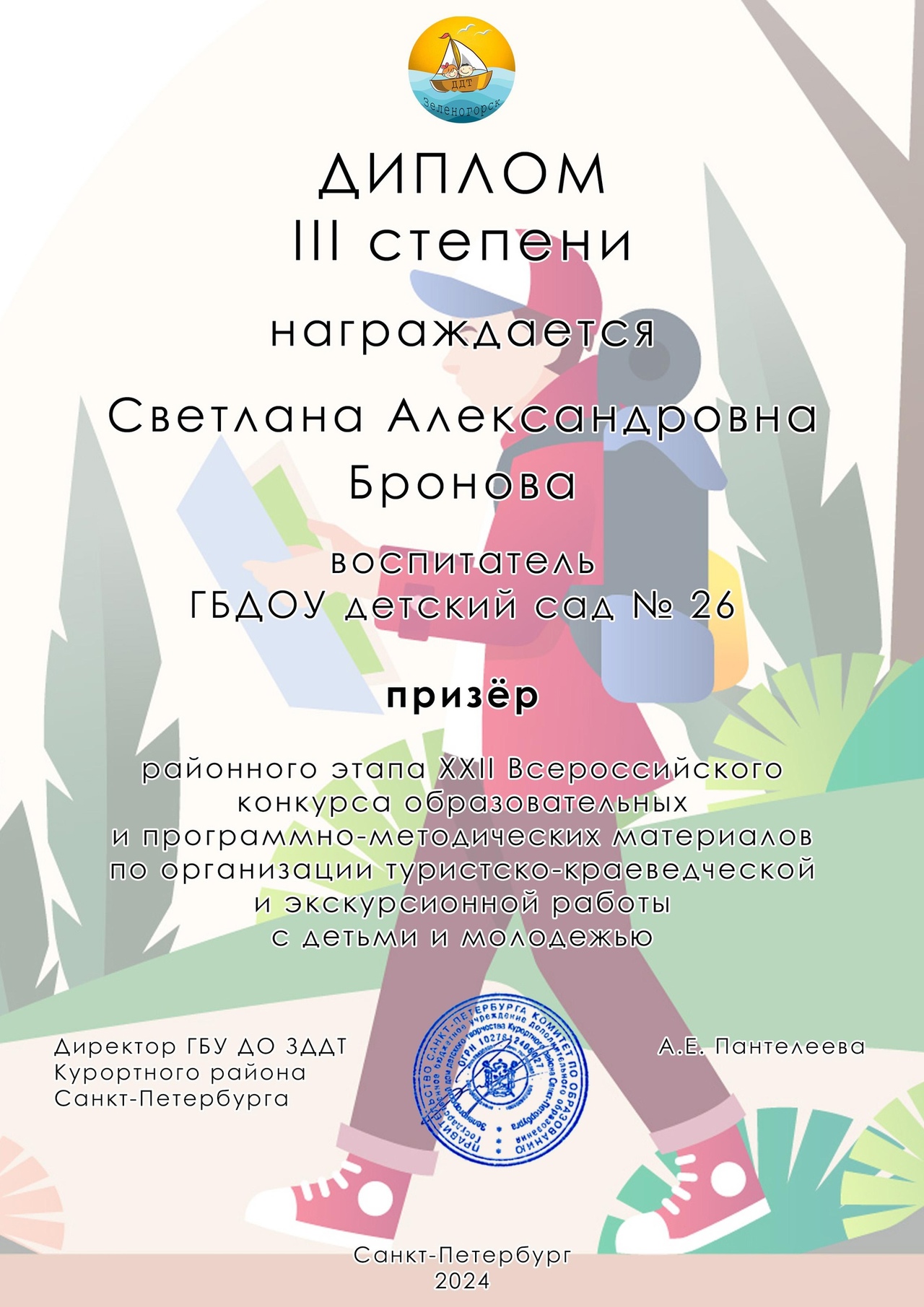 Бронова Светлана Александровна принимала участие в районном этапе XXII Всероссийского конкурса образовательных и программно-методических матералов по организации туристско-краеведческой и экскурсионной работы с детьми и молодёжью.