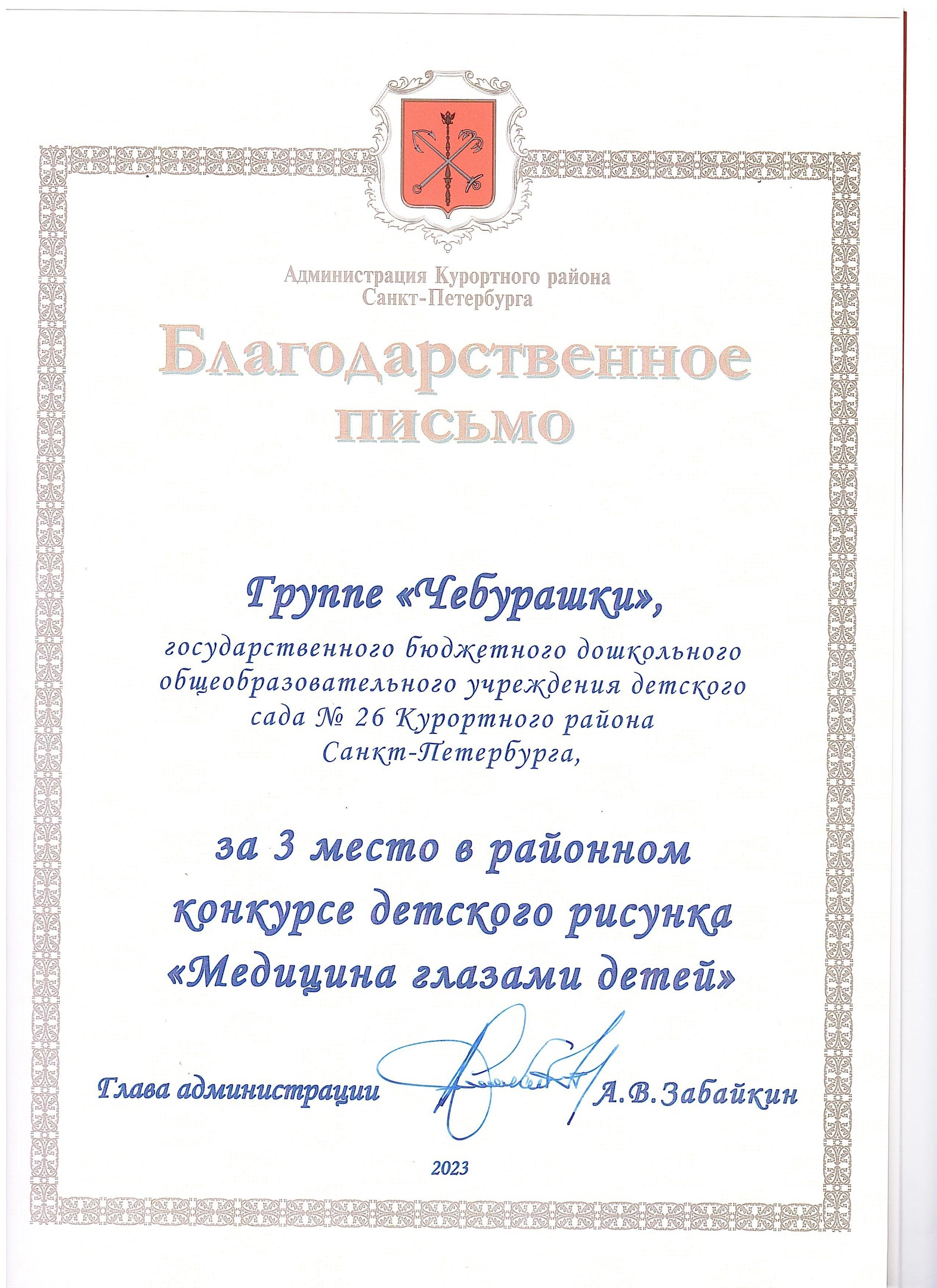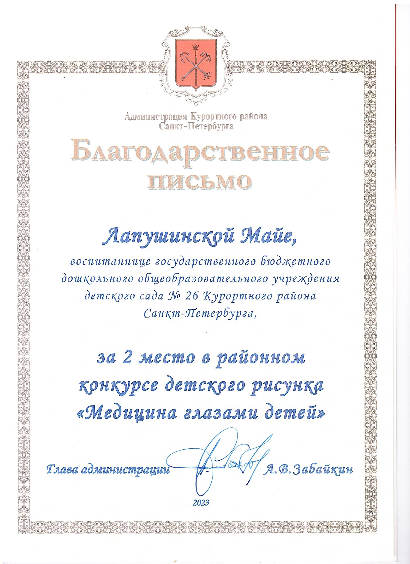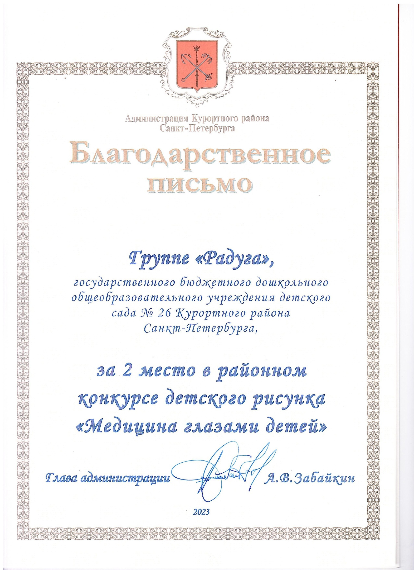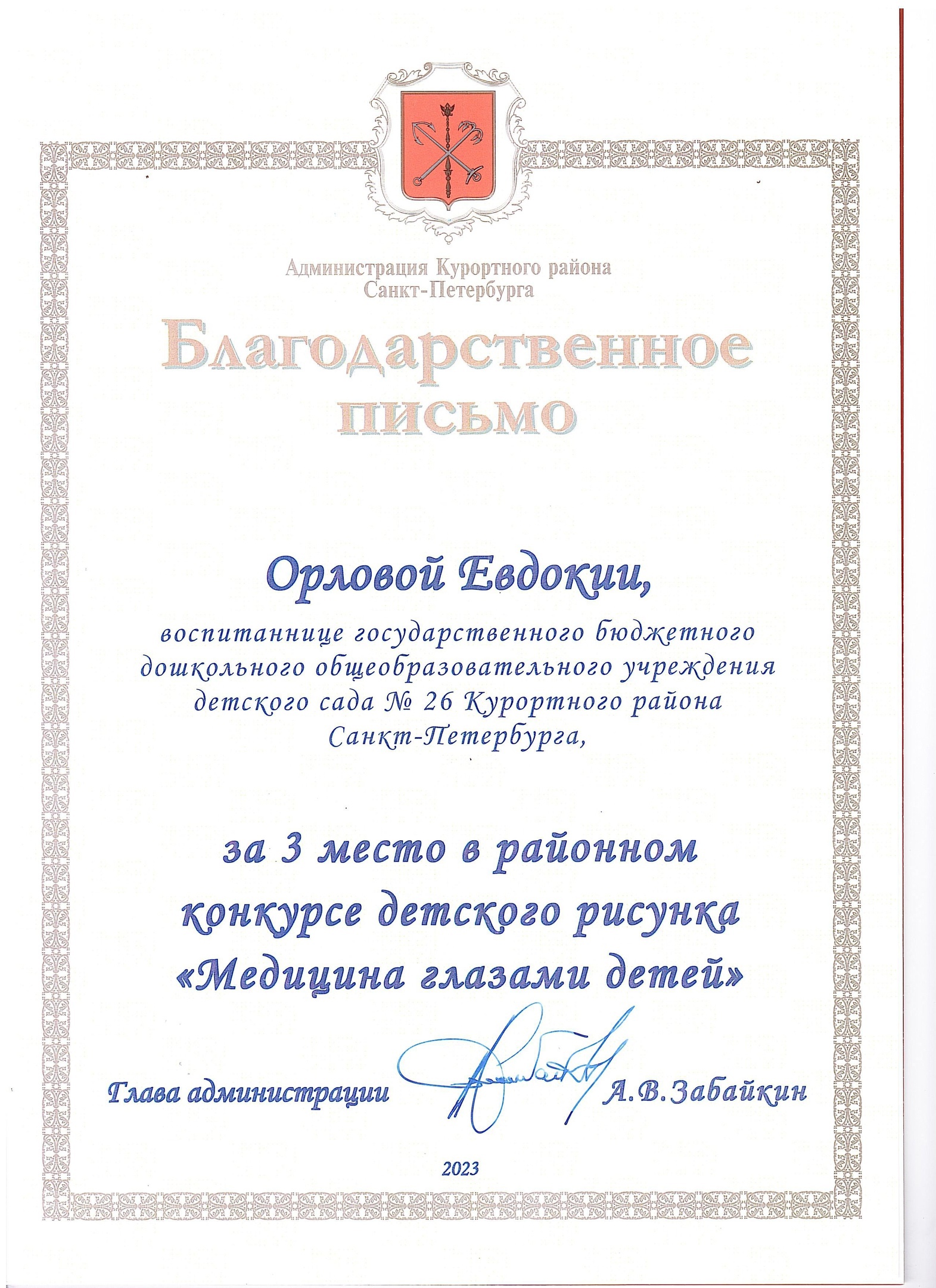 Глава администрации Курортного района Санкт-Петербурга благодарит победителей конкурса "Медицина глазами детей"